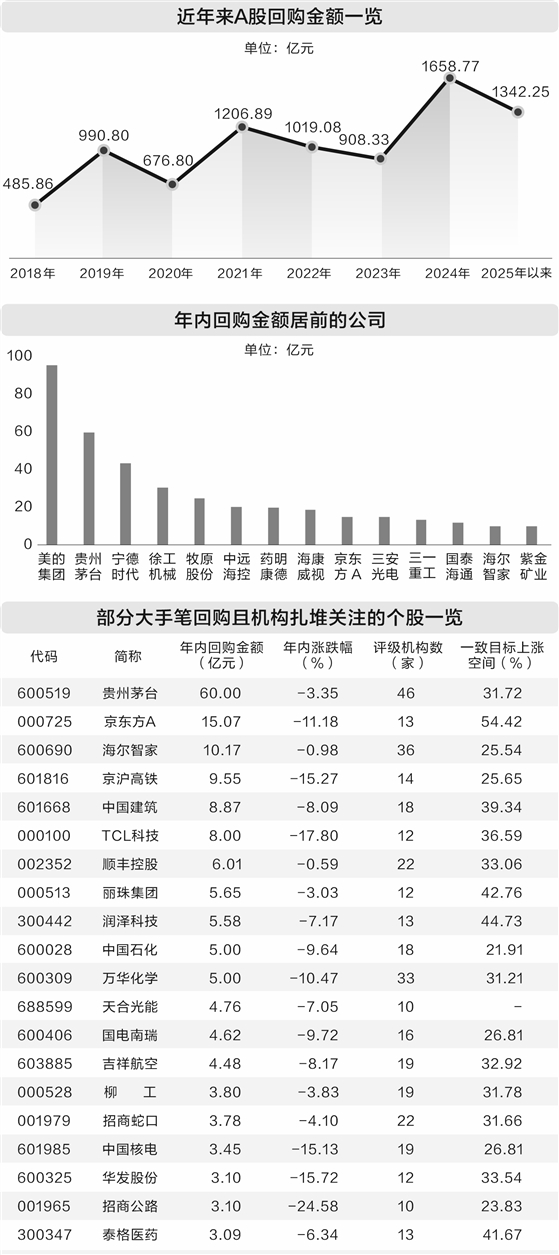 据证券时报·数据宝统计,以最新公告时间统计,2025年以来A股市场共有1400多家实施了回购,已回购金额合计达到1342.25亿元。这是A股历史上第4次年度回购金额超过千亿元,2021年、2022年和2024年回购金额分别为1206.89亿元、1019.08亿元和1658.77亿元。也就是说,今年A股回购金额将达到历史第二高水平。