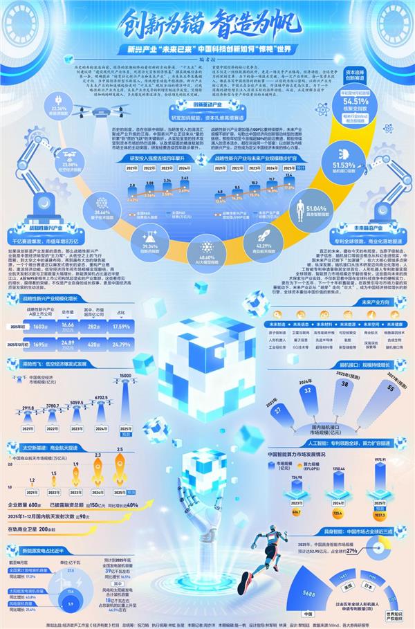 历史的车轮滚滚向前,经济的浪潮始终向着创新的方向奔涌。“十五五”规划建议将“建设现代化产业体系,巩固壮大实体经济根基”摆在战略任务的第一条,明确提出“培育壮大新兴产业和未来产业”,为未来五年发展锚定方向。当中国经济转型不断深入,传统增长动能平稳换挡,新兴产业与未来产业的加速崛起恰是对“十五五”规划方向的精准呼应,以战略性新兴产业为支撑、未来产业为先导的新增长极逐步成型,凭借持续加码的研发投入、多点爆发的赛道活力、全球领先的技术突破,重塑中国经济的核心竞争力。